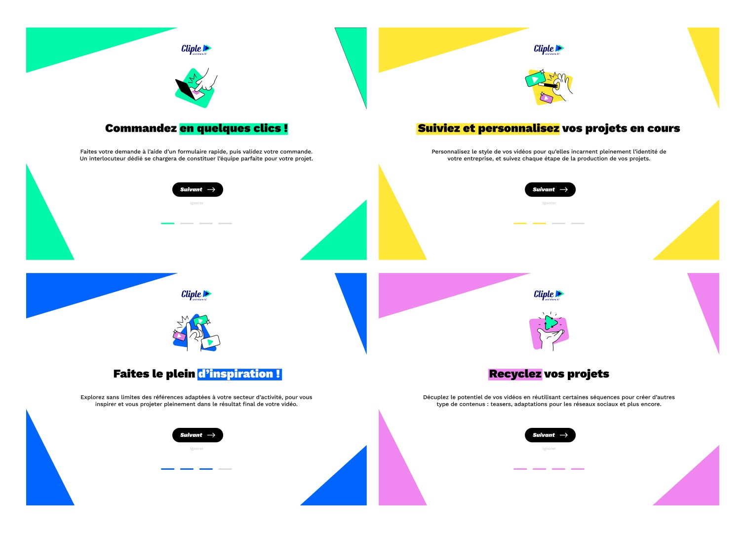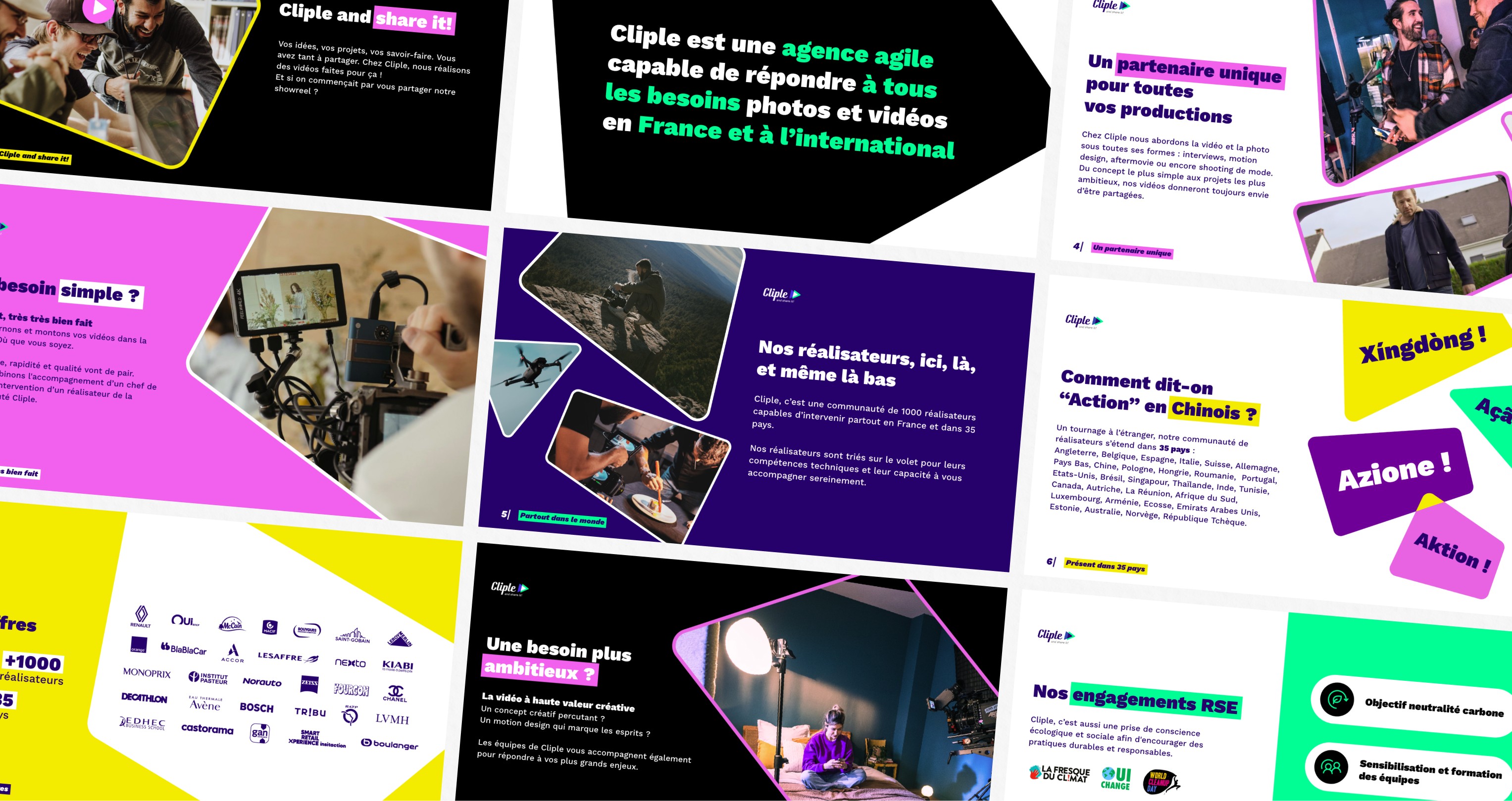J’ai commencé par la réalisation de la présentation commerciale de l’agence, pierre angulaire de la nouvelle direction artistique. Ce support clé, utilisé en rendez-vous client, devait incarner l’identité de Cliple et traduire visuellement sa posture agile, accessible et créative.